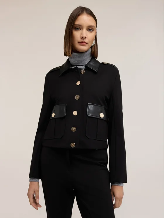 Giacca in punto milano misto viscosa con inserti in tessuto spalmato; modello corto con vestibilità boxy, chiusura con bottoni a vista; colletto classico, tasche applicate sul davanti, maniche lunghe.
