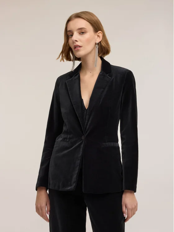 Blazer in velluto; modello monopetto con chiusura a bottone; maniche lunghe e revers classico.