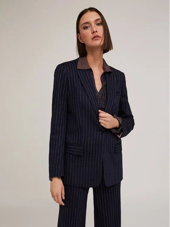 Blazer sfoderata in tessuto misto lino gessato; colletto a lancia e abbottonatura monopetto ad un bottone; tasche anteriori con patta, maniche lunghe