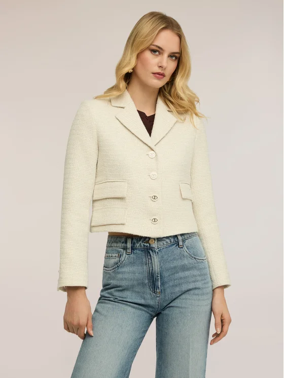 Giacca corta in tessuto bouclé misto cotone; collo a revers con chiusura a quattro bottoni frontali; maniche lunghe e tasche frontali applicate con patta.