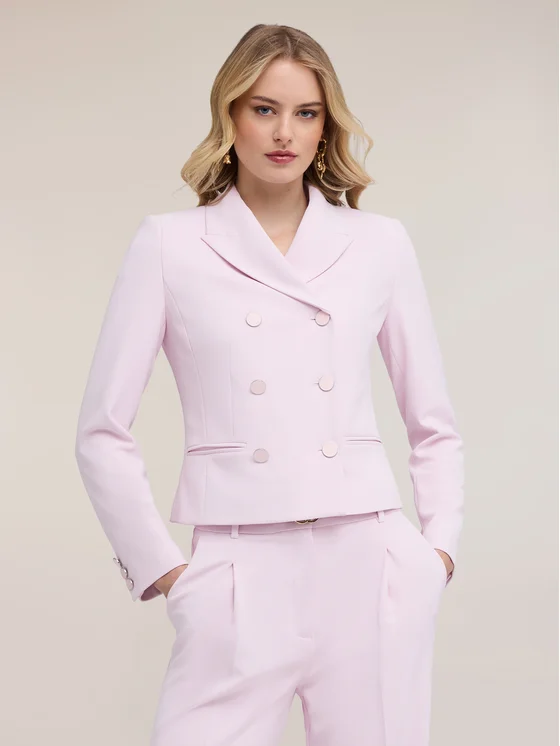 Giacca strutturata in cady crêpe; modello doppiopetto con vestibilità fitted, chiusura a bottoni e fodera interna; revers classici, maniche lunghe con bottoni decorativi al polso e tasche a filetto.