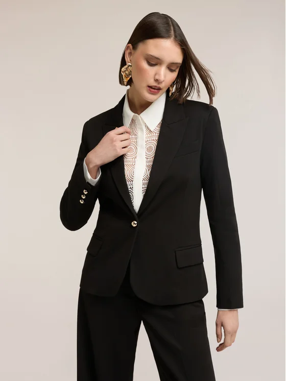 Blazer in tessuto crepe con fodera interna a righe; modello monopetto con vestibilità regular e chiusura ad un bottone; maniche lunghe con tasche applicate.