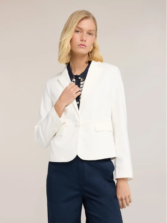 Blazer in cotone tecnico; modello fitted, chiusura monopetto a un bottone e fodera interna; revers classici, due tasche applicate con pattina, maniche lunghe con bottoni ai polsi.