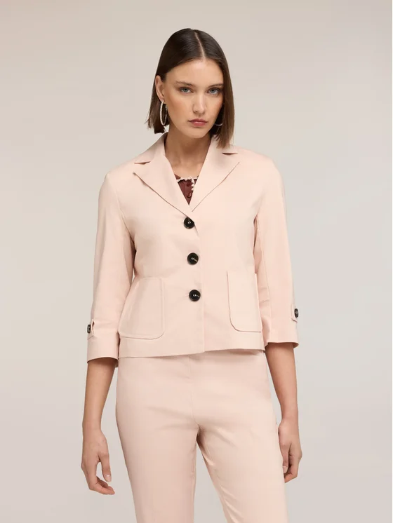 Giacca blazer in misto cotone con fodera interna; collo a revers e chiusura frontale a tre bottoni; maniche a tre quarti con bottone decorativo al polsino e due tasche frontali applicate.