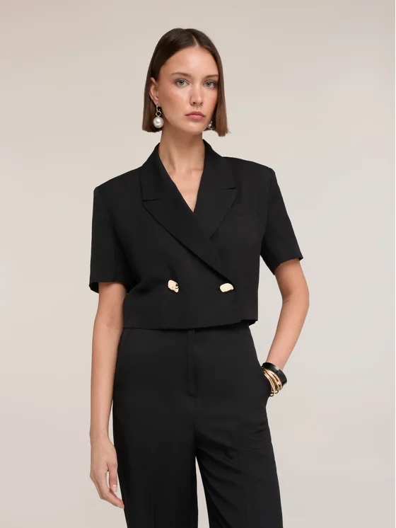 Giacca strutturata in tessuto misto viscosa lino; modello con vestibilità boxy e chiusura doppiopetto con bottoni; maniche corte con spacco e revers classici.
