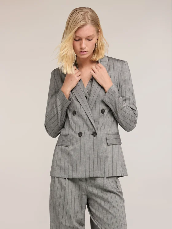 Blazer doppiopetto in tessuto tinto filo misto lino; revers a lancia con chiusura doppiopetto; maniche lunghe e tasche applicate.