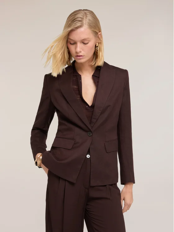 Giacca in tessuto misto lino lyocell senza fodera interna; colletto a revers con chiusura monopetto ad un bottone; due tasche applicate con patta, maniche lunghe con bottoni decorativi ai polsi.