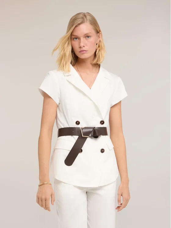 Blazer in cotone tinta unita; modello con chiusura doppiopetto a bottoni e cintura in vita inclusa; maniche corte, collo a revers.
