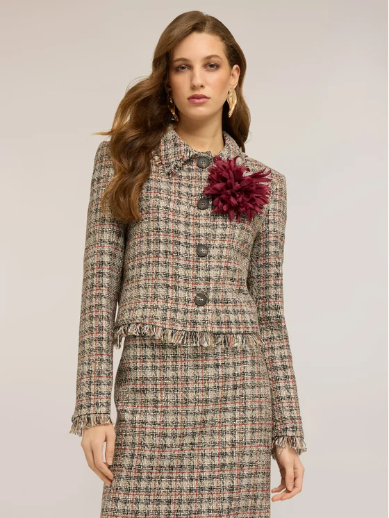 Giacca in tessuto bouclé tinto filo; chiusura frontale con collo classico e bottoni a vista, orlo sfrangiato; maniche lunghe, spilla floreale removibile; MADE IN ITALY.