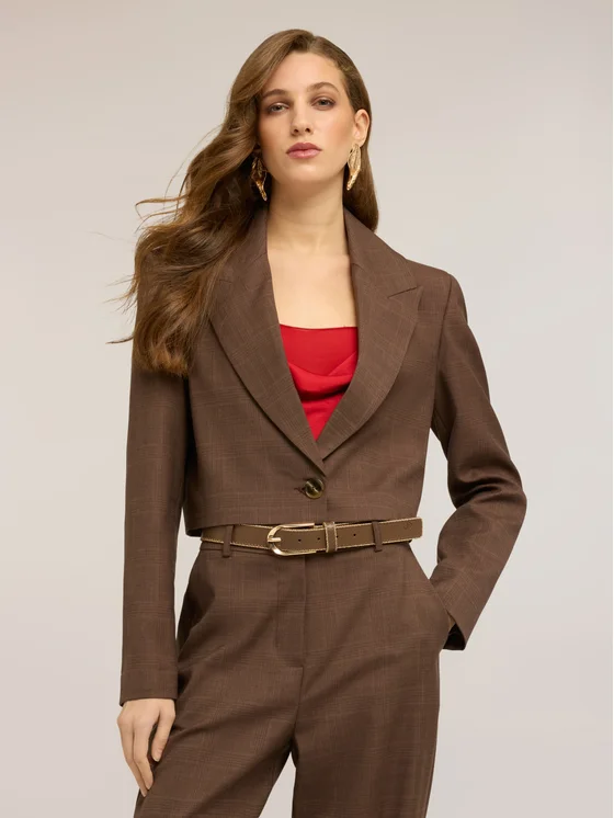 Giacca spencer in tessuto tinto filo fantasia check; chiusura monopetto ad un bottone e fodera interna; maniche lunghe; MADE IN ITALY.