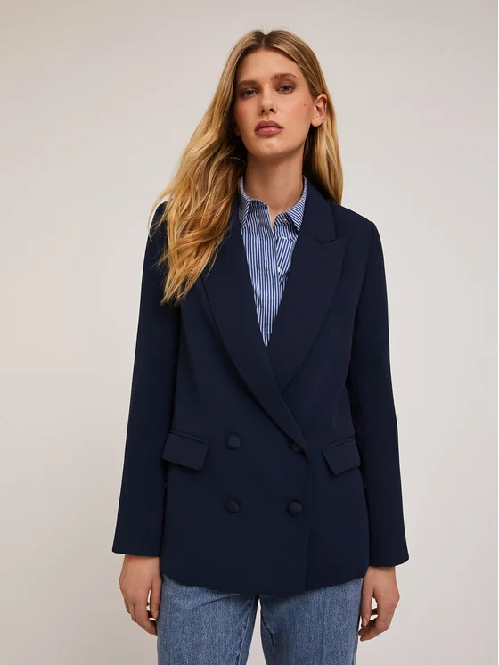 Blazer over in envers satin tinta unita con fodera interna; colletto a lancia e abbottonatura a doppiopetto con bottoni foderati lucidi; tasche anteriori con patta, maniche lunghe