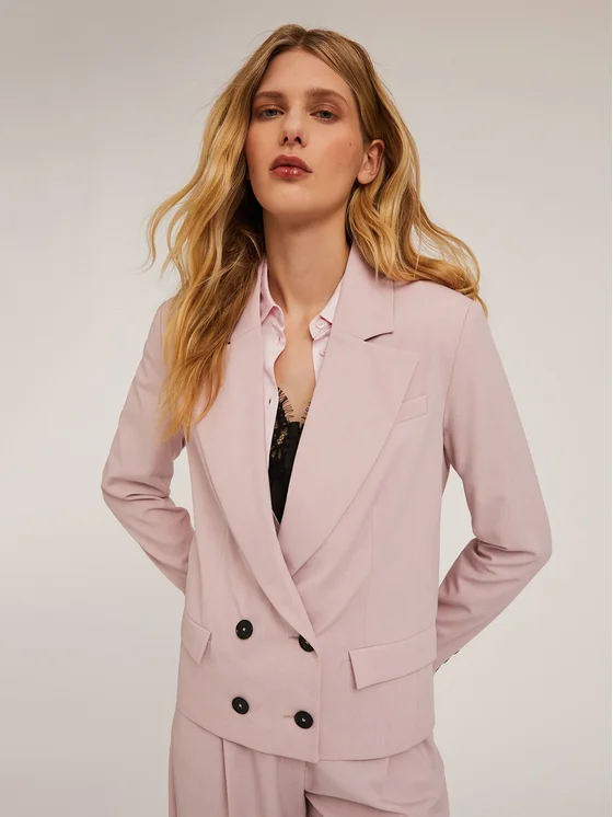Giacca blazer corta in poliviscosa con fodera interna; apertura frontale con colletto a revers e abbottonatura doppiopetto; tasche anteriori a patta, maniche lunghe