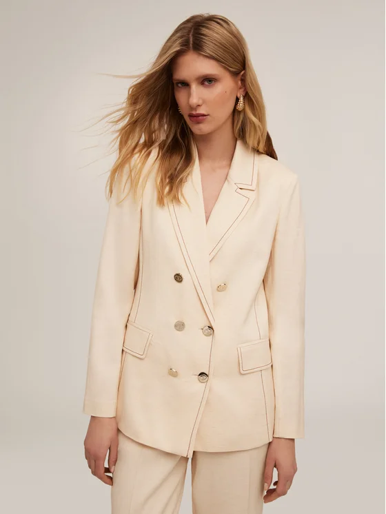 Blazer in tela cotone lino con impunture a contrasto; colletto a revers e chiusura a doppiopetto con bottoni metallici; tasche anteriori con patta, maniche lunghe