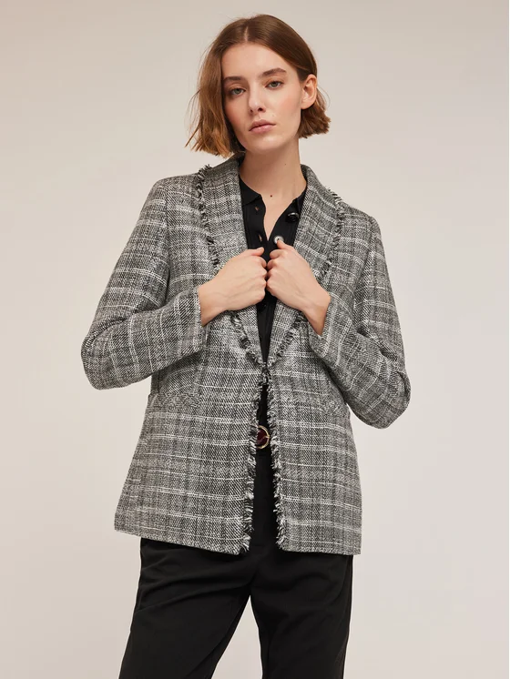 Giacca in tweed fantasia check con paillettes trasparenti e bordi sfrangiati; apertura frontale con colletto a scialle e gancetto metallico; tasche anteriori a filetto, maniche lunghe