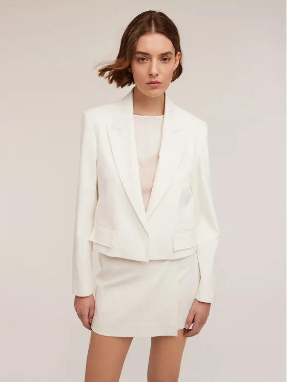Blazer corta sartoriale in cotone misto viscosa con fodera interna tono su tono; colletto a lancia con impunture a sellaio e abbottonatura nascosta con bottone automatico; tasche anteriori con patta, maniche lunghe con gemelli sul fondo