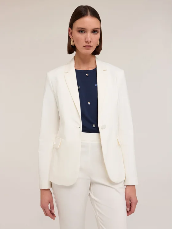 Blazer monopetto in cotone tecnico; colletto a revers e abbottonatura ad un bottone; tasche anteriori con patta, maniche lunghe