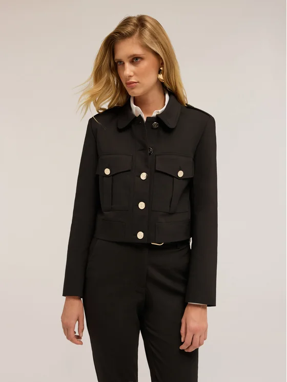 Giacca cropped in tessuto doppio di cotone; apertura frontale con colletto a vela e bottoni a vista, tasche anteriori applicate con patta e bottoni; maniche lunghe con mostrine sulle spalle
