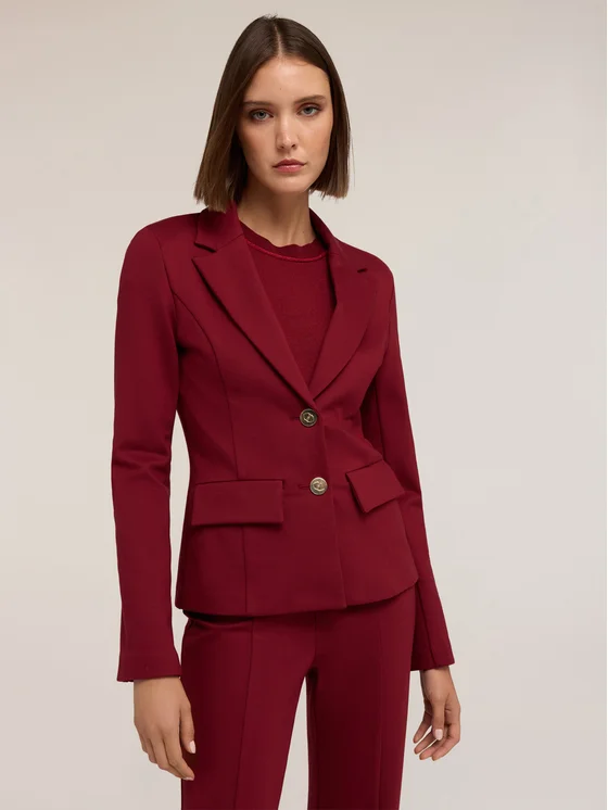 Blazer in punto milano tinta unita senza fodera interna; apertura frontale monopetto con colletto a revers e chiusura ad un bottone; maniche lunghe, tasche anteriori con patta