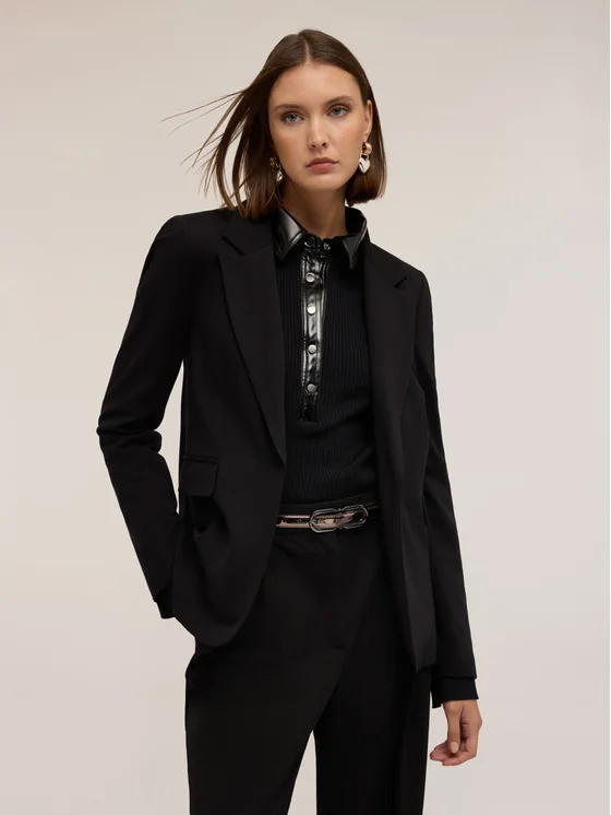 Blazer monopetto in punto milano con fodera interna; colletto a revers e abbottonatura monopetto ad un bottone; tasche anteriori con patta, maniche lunghe