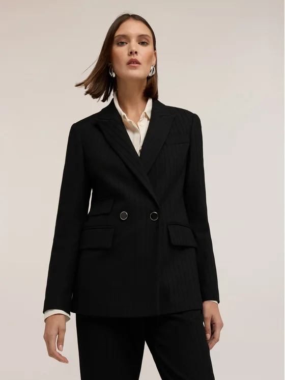 Giacca strutturata in filato misto viscosa gessata; lunghezza media con vestibilità regular, chiusura doppiopetto con bottoni; maniche lunghe, tasche a patta sul davanti.