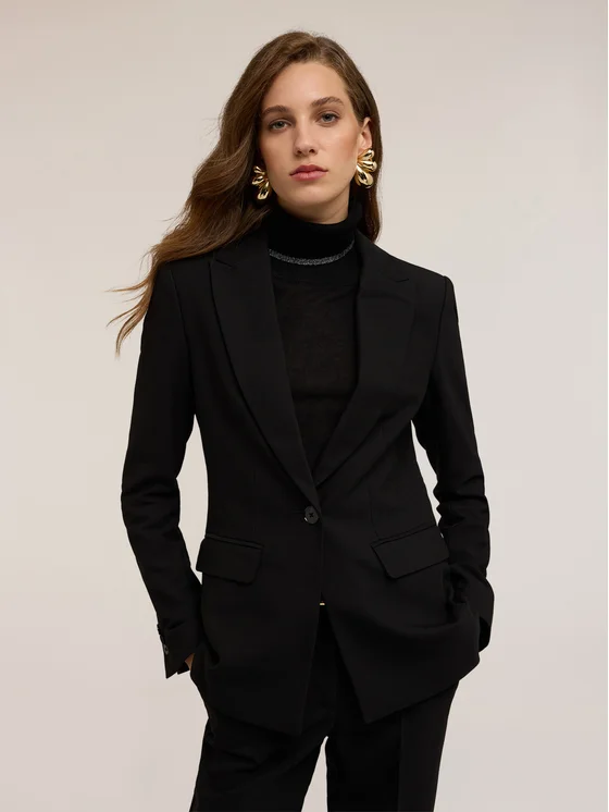 Blazer monopetto in tessuto misto viscosa tinta unita; apertura frontale con colletto a lancia e bottone a vista; tasche anteriori con patta, maniche lunghe