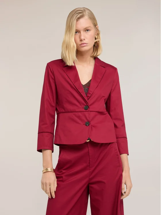 Blazer in raso di cotone; modello fitted con chiusura a due bottoni; collo a revers, maniche lunghe e dettagli ajouré orizzontali.