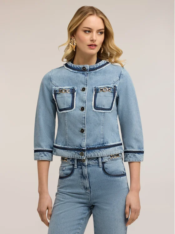 Giacca in denim di cotone light blue wash; taglio corto, chiusura frontale con bottoni; maniche a tre quarti, scollo a barchetta, due tasche frontali con catene decorative.