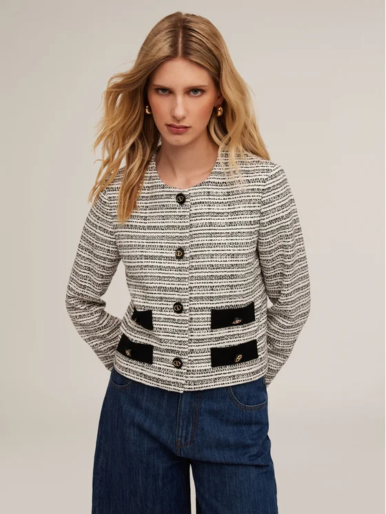 scollo tondo frontale e chiusura con bottoni con logo; tasche anteriori applicate, maniche lunghe