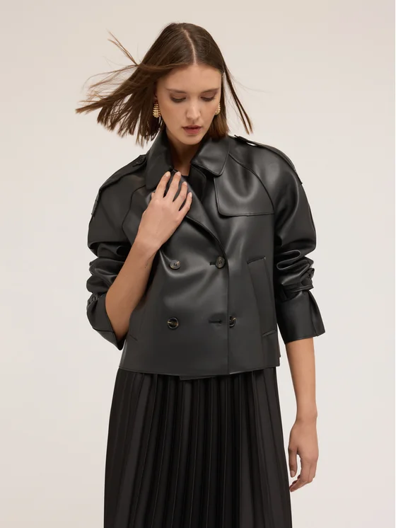Trench corto in tessuto spalmato senza fodera interna; chiusura doppiopetto con bottoni a vista, tasche anteriori verticali; maniche lunghe con taglio raglan e cinturino al fondo