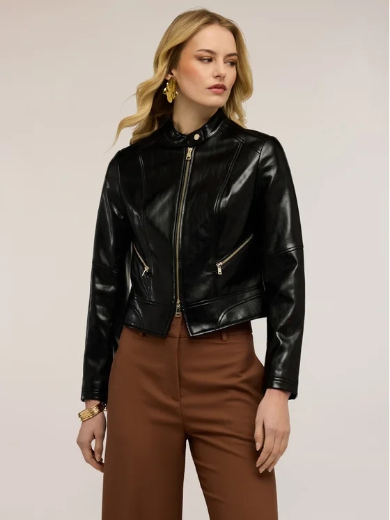 Giubbotto in tessuto spalmato lucido con fodera interna; modello corto con vestibilità fitted, chiusura con zip; maniche lunghe, collo alla coreana con bottone e tasche con zip diagonali.