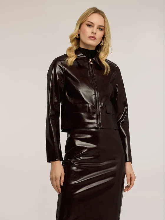Giacca in tessuto sintetico lucido; modello corto con vestibilità boxy e chiusura con zip frontale; maniche lunghe e colletto classico.