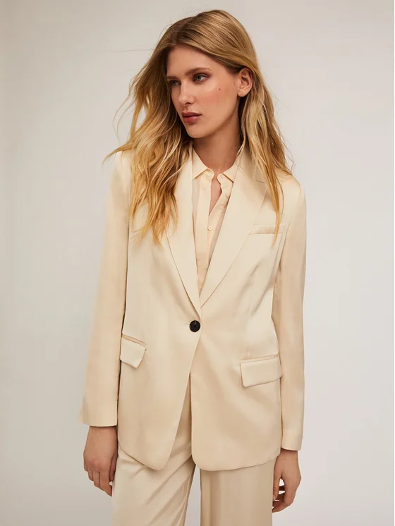 Blazer monopetto in raso con fodera interna; colletto a lancia e abbottonatura monopetto ad un bottone; tasche anteriori con patta, maniche lunghe