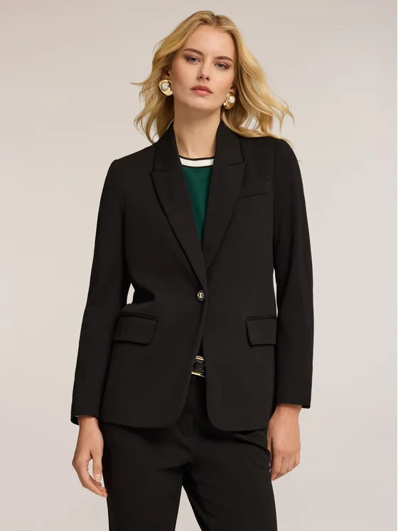 Giacca blazer in tessuto crêpe con fodera interna a pois; apertura frontale con colletto a lancia e abbottonatura monopetto ad un bottone; tasche anteriori a patta, maniche lunghe; Parte di questo prodotto è realizzato con materiale riciclato, minimo il 20%.