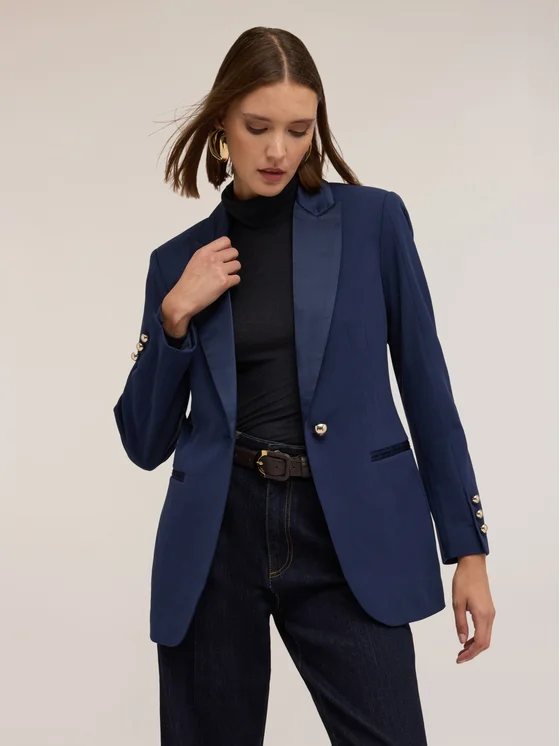 Giacca blazer in tessuto crêpe; colletto a lancia in raso e chiusura monopetto con bottone metallico; tasche anteriori a doppio filetto, maniche lunghe