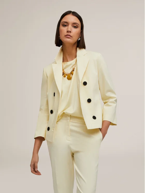 Giacca da completo in tessuto tecnico misto cotone; apertura frontale a doppiopetto con colletto a revers e bottoni a vista in contrasto colore; tasche anteriori verticali, maniche lunghezza tre quarti