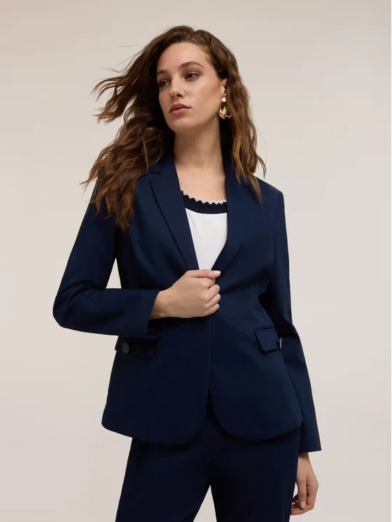 Blazer monopetto in cotone tecnico; colletto a revers e abbottonatura ad un bottone; tasche anteriori con patta, maniche lunghe