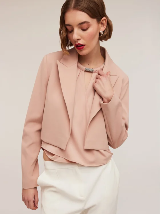 Giacca spencer in tela misto cotone viscosa stretch con fodera interna; apertura frontale senza abbottonatura e con colletto a lancia; maniche lunghe