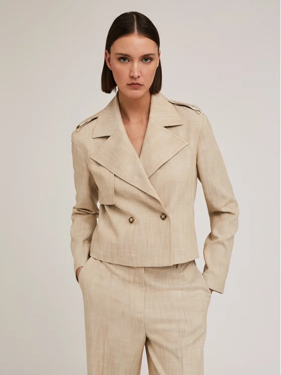 Giacca corta doppiopetto in poliviscosa con fodera interna; apertura frontale con colletto a revers e bottoni a vista, patta frangivento anteriore; maniche lunghe con mostrine sulle spalle