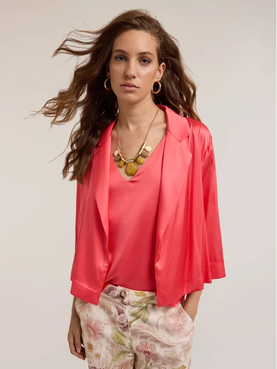 Giacca destrutturata in raso di viscosa stretch; apertura frontale con colletto a revers; maniche lunghezza tre quarti