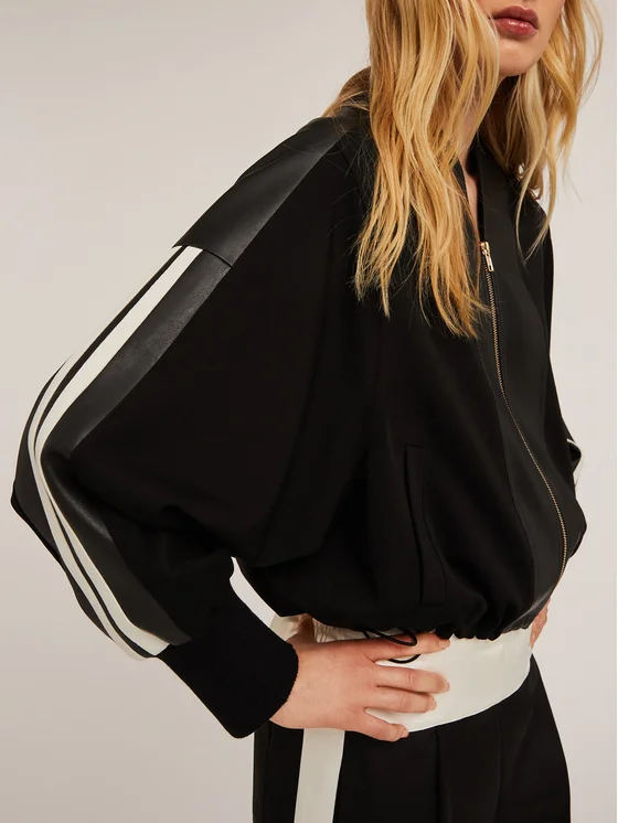 Bomber in tessuto tecnico ed inserti in tessuto spalmato; apertura frontale con scollatura a v e zip metallica; maniche lunghe ampie con banda laterale e polsino a coste, coulisse regolabile sul fondo