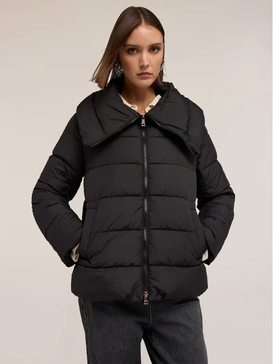 Piumino pesante in nylon trapuntato; modello corto con vestibilità regular, chiusura con zip a doppio cursore; collo alto, maniche lunghe, tasche anteriori verticali