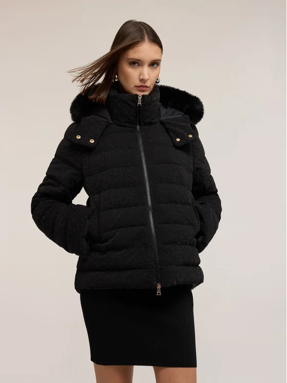 Piumino pesante trapuntato in nylon shiny; vestibilità regular, cappuccio con bordo rimovibile e chiusura frontale con zip; maniche lunghe, tasche laterali a filetto.