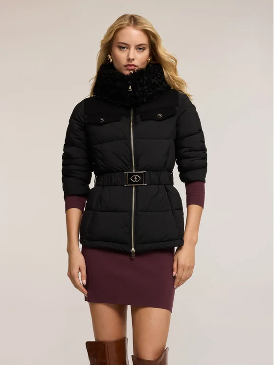 Piumino in nylon trapuntato con inserti; modello corto con colletto alto peluche, chiusura frontale con zip e cintura in vita elastica; tasche con patta sul petto, maniche lunghe.
