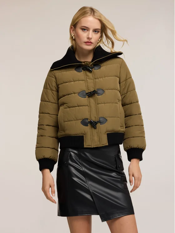 Piumino in nylon trapuntato; vestibilità boxy, chiusura con zip e alamari; collo alto in maglia, maniche lunghe.