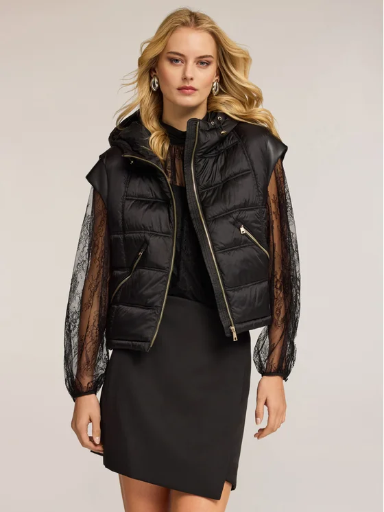 Piumino in nylon trapuntato; modello senza maniche con inserto in tessuto spalmato; scollatura frontale con cappuccio e zip metallica, tasche anteriori