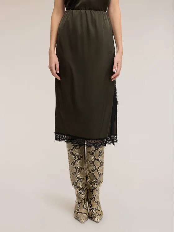 Gonna tubino in raso di viscosa; lunghezza midi con fascia elastica in vita; lavorazione in pizzo sui bordi; MADE IN ITALY.