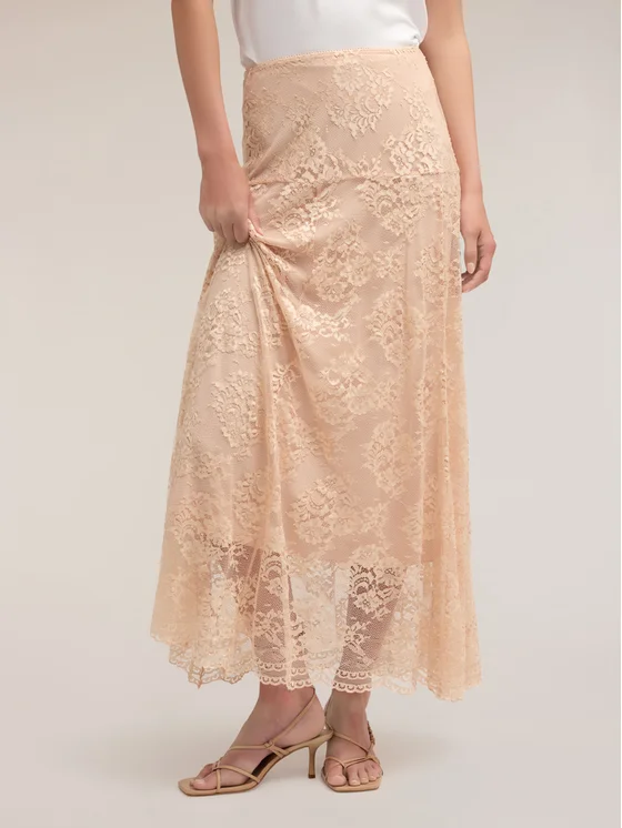Gonna lunga in pizzo; fodera interna tono su tono; chiusura laterale con zip