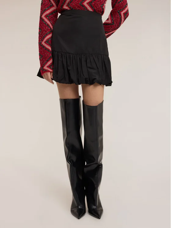 Gonna corta svasata; volants sul fondo in taffetà; chiusura con zip.