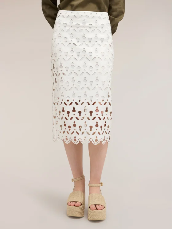 Gonna tubino in tessuto coated effetto sangallo; lunghezza midi, vita alta, chiusura con zip; orlo inferiore smerlato, fodera interna.