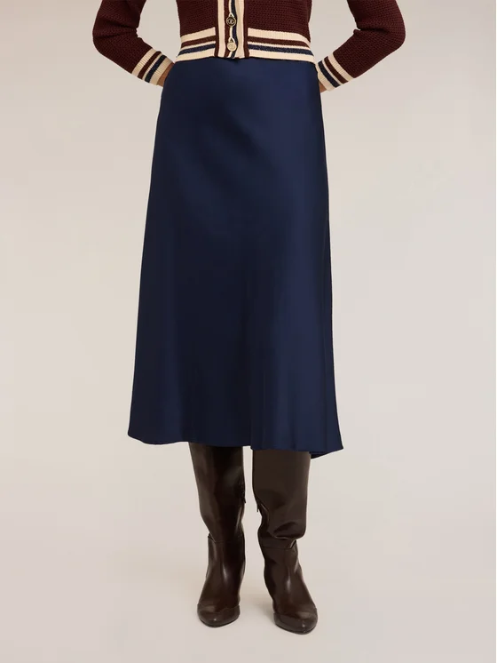 Gonna midi in raso stretch; linea svasata sul fondo; chiusura con zip invisibile